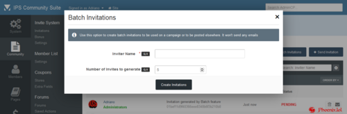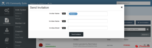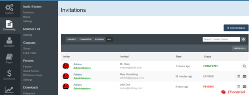 Invitations Management: a place where you can see the status of each invitation. The statuses are PENDING, CONVERTED, and EXPIRED. You can invite people, and delete or resend invitations. You can also create batch invitations, to be used on a campaign or to be posted elsewhere. It won't send any emails.