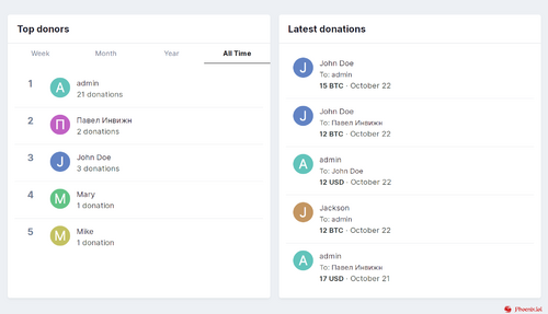 - Последние пожертвования. Виджет покажет донору, автора сообщения, дату и сумму пожертвования.