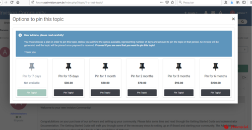 Будет создан счет, и тема будет закреплена после получения оплаты автоматически. В то же время, тема не будет доступна для того, чтобы быть закрепленной кем-либо еще. Существует настройка в приложении Commerce, чтобы определить количество дней, через которое срок действия счета истечёт (ACP -> Commerce -> Invoices -> Invoice Settings -> Invoices must be paid within). Вы можете изменить значение по умолчанию (30 дней) на что-то, что соответствует вашим потребностям.