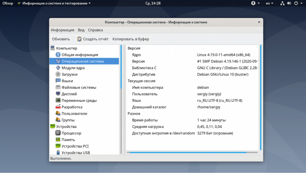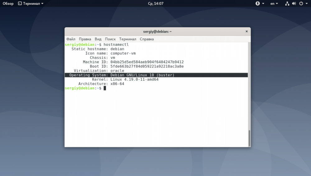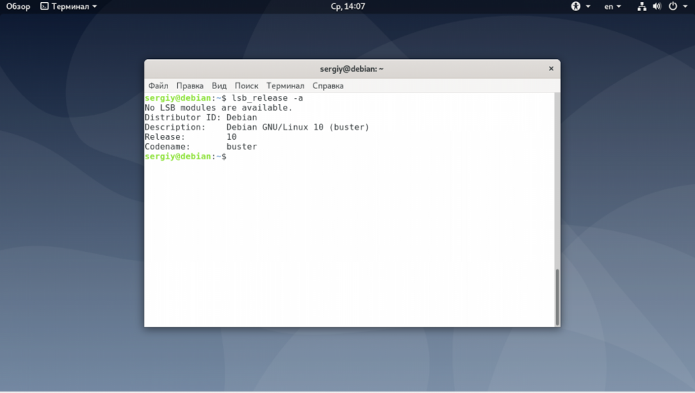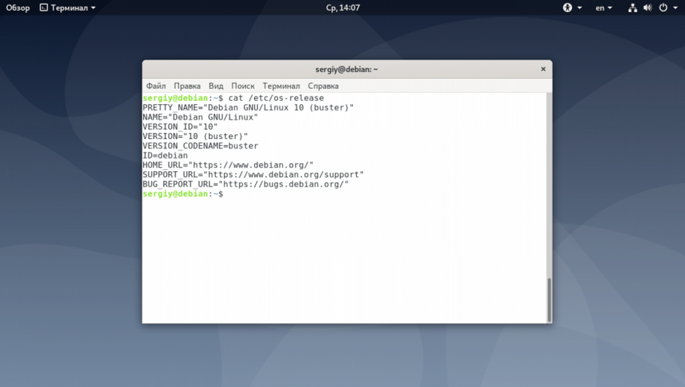 Как узнать версию Debian Новые версии Debian выходят раз в несколько лет. От версии зависит какие репозитории будут у вас работать, а также какие версии программ вы сможете поставить. Если вы сами устанавливали операционную систему, то наверняка знаете какая версия у вас установлена. Из этой статьи вы узнаете как узнать версию Debian из консоли или в графическом интерфейсе. Причём здесь более важен не сам номер версии, а кодовое имя, по которому будут добавляться репозитории. Как узнать версию Debian Самый простой способ посмотреть версию Debian - использовать утилиту lsb_release с опцией -a. Она отображает LSB (Linux Standard Base) информацию про установленный дистрибутив: lsb_release -a Чтобы вывести информацию в более коротком виде, в одну строку используйте опцию -d: lsb_release -d Также версию Debian можно определить в файле /etc/os-release. Просто посмотрите его содержимое: $ cat /etc/os-release Основную информацию о системе показывает ещё утилита hostnamectl, в том числе она показывает версию и кодовое имя дистрибутива: $ hostnamectl Ещё версию дистрибутива, но не кодовое имя можно проверить в файле /etc/issue: # cat /etc/issue В Debian есть файл /etc/debian_version в котором указана версия Debian включая версию точечного релиза: $ cat /etc/debian_version Если вы хотите посмотреть версию Debian в графическом интерфейсе, вам следует использовать утилиту hardinfo. Для её установки выполните: $ sudo apt install hardinfo Затем запустите её из главного меню и найдите версию дистрибутива в разделе Компьютер -> Операционная система: Иногда бывает необходимо определить версию ядра Debian. Для этого используется стандартная для всех дистрибутивов команда uname: $ uname -a Кроме самой версии дистрибутива в Debian может использоваться три вида репозиториев: Stable - стабильный текущий релиз; Testing - тестовый репозиторий, который в будущем станет стабильным; Unstable - репозиторий, в котором находится самая нестабильная версия пакетов Debian, они ещё проходят тестирование и подготовку для включения в testing. Чтобы понять какой репозиторий используется в вашей системе надо открыть файл /etc/apt/sources.list: $ cat /etc/apt/sources.list Нас будет интересовать такая строчка: deb http://deb.debian.org/debian/ buster main contrib non-free Вам надо обратить внимание на слово после URL репозитория. Если там написано кодовое имя, например buster - это стабильный выпуск Debian. Если вместо кодового имени там есть слово testing - у вас версия, которая станет стабильной при следующем релизе. Если же вместо кодового имени только unstable - у вас используется нестабильный репозиторий.