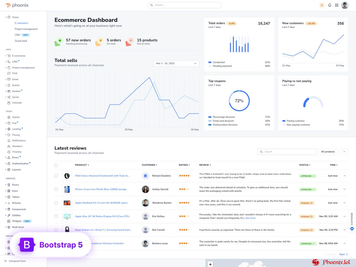 Guy Fawkes Posted September 25, 2025 Posted September 25, 2025 Phoenix – Admin Dashboard & WebApp Template [HTML] View File Phoenix – Admin Dashboard & WebApp Template From the creators of Falcon, Falcon React, and Sparrow, the core ThemeWagon team has built Phoenix to surpass all previous experiences. It is designed with a solid experience base of designing UX/UI for over a decade, along with the feedback from thousands of satisfied customers to contain a distilled experience of the team and the best of our designing experiences along with the front-end development with Bootstrap and modern JavaScript. Start with the solid base of Phoenix – not just to look good from the outside but also to have a code base that is solid, performant, and well-documented to modify without much hassle. The clean codes will help you rank higher in search engine results. The theme is built to be fully responsive to all screen sizes and devices, including retina screens, and is cross-browser compatible. In addition to the latest technologies, this template features all modern amenities like a burger menu, dark mode, geolocation, built-in fonts and icons, predefined HTML pages, and more on a meticulously designed layout. This template will surely help you excel in your next admin dashboard project. Enjoy creating with Phoenix! Key Features: Built on Bootstrap 5 CSS3 & HTML5 Clean & minimal design Fully Responsive No jQuery dependencies Cross-browser tested & optimized Gulp & Rollup based workflow Compatible with WebPack Modular markup based on Cards & Utility classes W3C-validated HTML pages Dark and Light Modes Enabled 100+ sets of UI Components 35 sets of Plugins Thoughtfully redesigned popular plugins 3 Sets of Icons Cross-browser tested & optimized Lifetime free updates Full-width layouts Modular markup based on Cards & Utility classes Interactive and functional components and pages FontAwesome 6 Icons Fonts Integrated Functional ChartJS, Echarts & Leaflet Maps Figma design file In the Box: 189 HTML files JavaScript source codes CSS & SCSS source codes All demo images & videos Pug source codes All plugins & libraries Documentation Design Files (Figma) Library & Plug-ins Echarts Chart.js List.js FontAwesome 6 Icons Fonts Feather Icons Unicons Choices.js Dropzone.js Tinymce Swiper Flatpickr Isotope Dayjs Is.js Lodash Submitter Guy Fawkes Submitted 09/25/25 Category Design Quote Donate Vi Veri Veniversum Vivus Vici If you need help installing any software from this site or any other - write to @Guy Fawkes - we will agree for a modest reward!